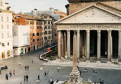 A perfect dome crowns a simple portico; the oculus opens the sky to the floor, showing Roman concrete at its purest.