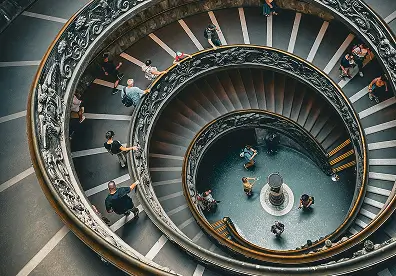 Photograph the Spiral Staircase from the top landing; wait for a lull to capture a clean spiral with people for scale.