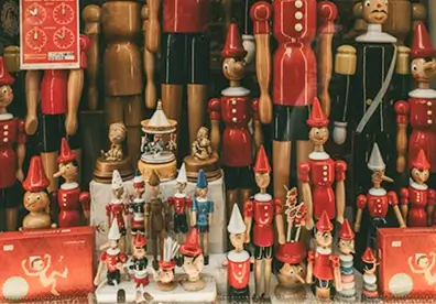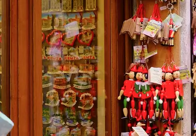 Italy’s wooden boy with a growing nose appears as marionettes and toys, the perfect souvenir that doubles as a storytelling prop back home.