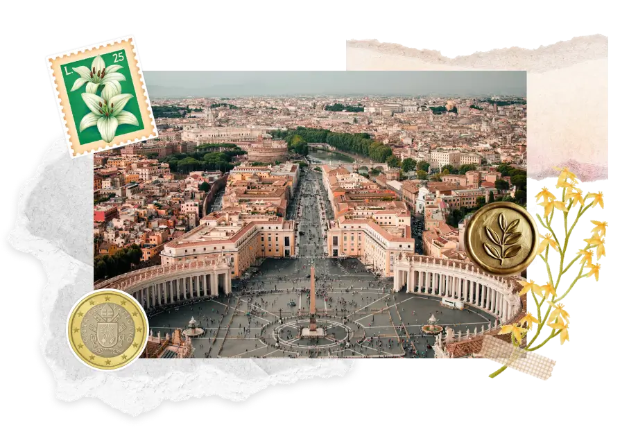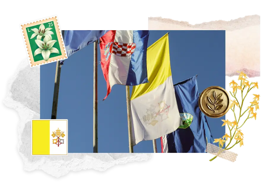 Spot flags in St. Peter’s Square and along Vatican walls; the Vatican Post Office sells neat stamp sets with the emblem.