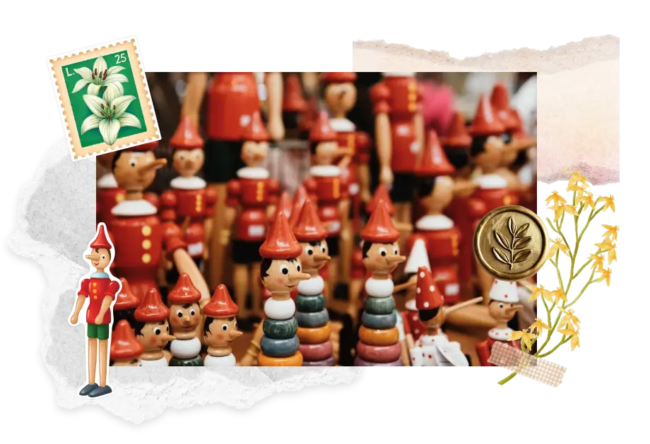 Carlo Collodi’s 1883 story set the template; artisans still carve noses from beechwood and paint by hand.