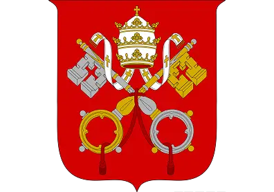 Yellow and white halves carry St. Peter’s crossed keys and papal tiara, a compact emblem of faith and sovereignty.