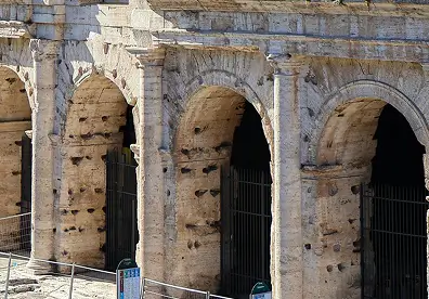 Find the travertine holes where iron clamps used to hold the stones together; they were stripped in later centuries, leaving pockmarks you see today.
